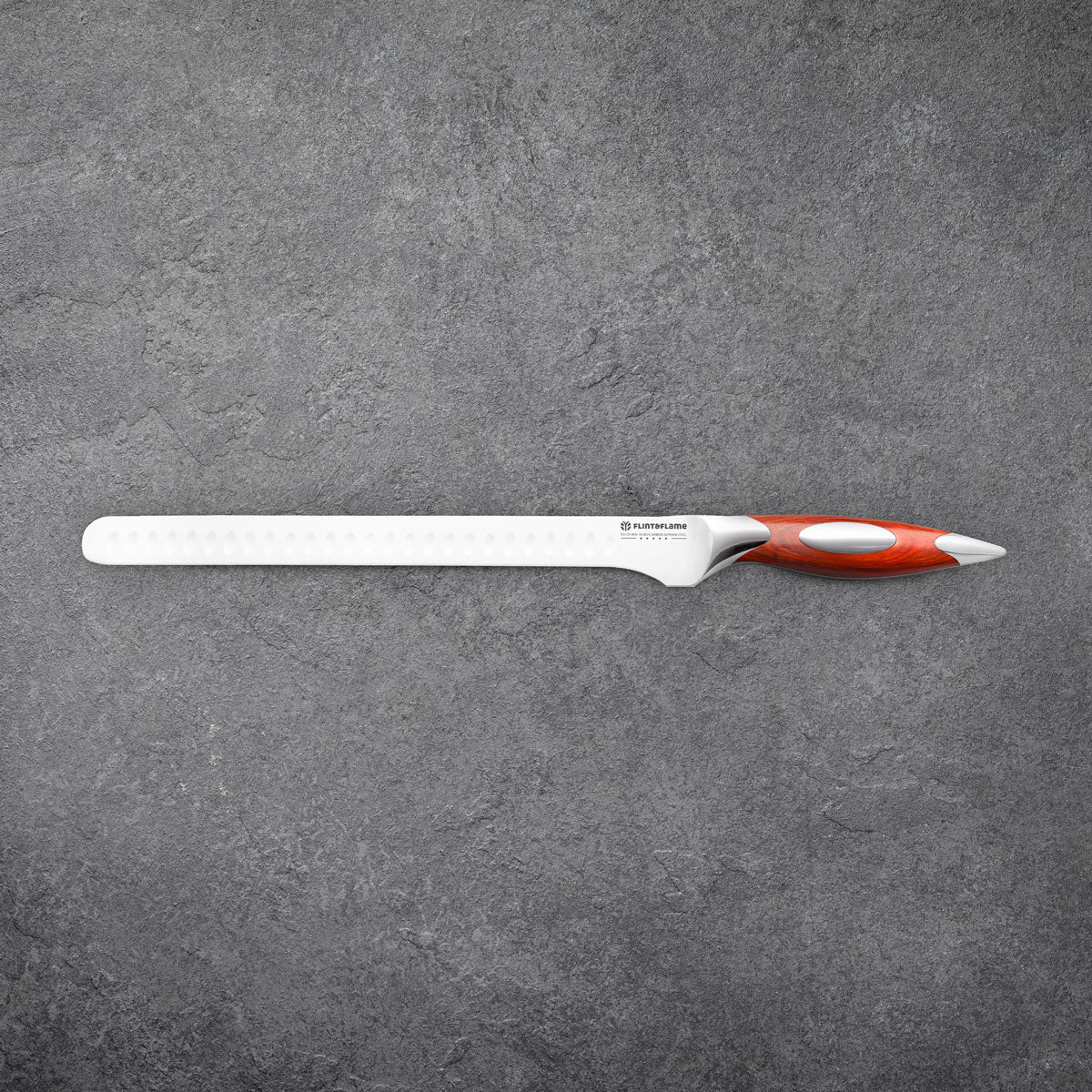 12″ Classic Series Ham/Brisket knife with a modern appearance, can carve more than you think. The blade is long and fine and boasts a little bit of flexibility that helps you achieve clean and easy slicing of any meat, from a joint of smoked ham to a tender roasted turkey. Due to the length of the scalloped blade, this knife is ideal for large cuts of meat such as briskets and even larger game you may be preparing. The silicone handle and modern appearance ensure you never lose your grip. Designed for Chefs & Home Cooks alike. This Flint & Flame knife arrives in our lockable blade cover.