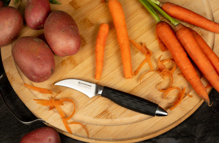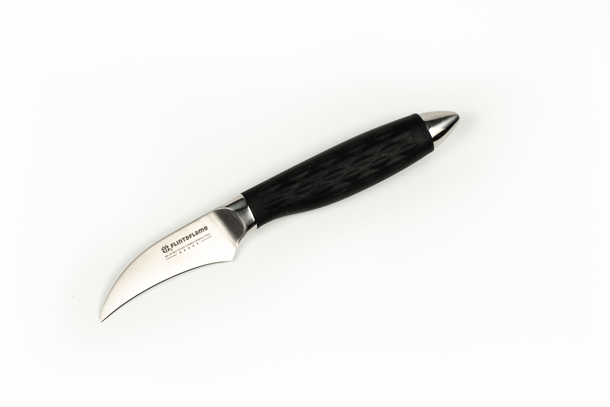 The Pro Series 2.5” Turning knife features our distinctive high impact silicone handle for exra grip with a modern appearance. This knife is similar to the paring knife in application as a small kitchen knife. The signature curved Bird’s Beak blade is extra useful as a Tournee knife for scoring and peeling. This Flint & Flame knife arrives in our lockable blade cover.