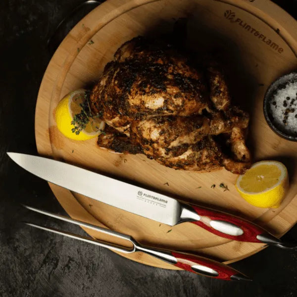 9” Carving Knife & Fork, presented in velvet lined black card box. Slightly longer than most carving blades, the 9” Carving Knife will ensure easy and thin slices when preparing meals of poultry, ham, roasts, as well as larger game. Its razor-sharp point makes it ideal for both boned and boneless joints. And the thinner blade allows for precision and maneuverability to achieve that perfect cut as you plate dinner.