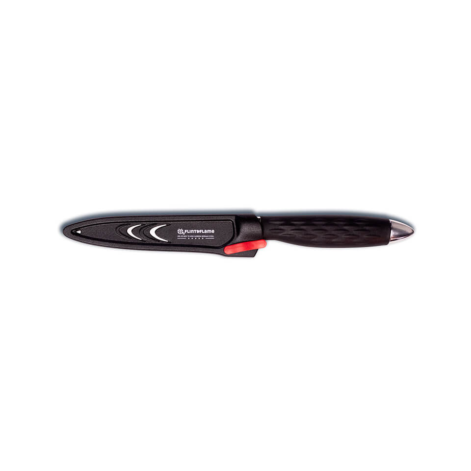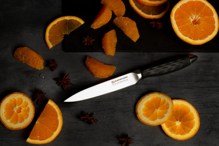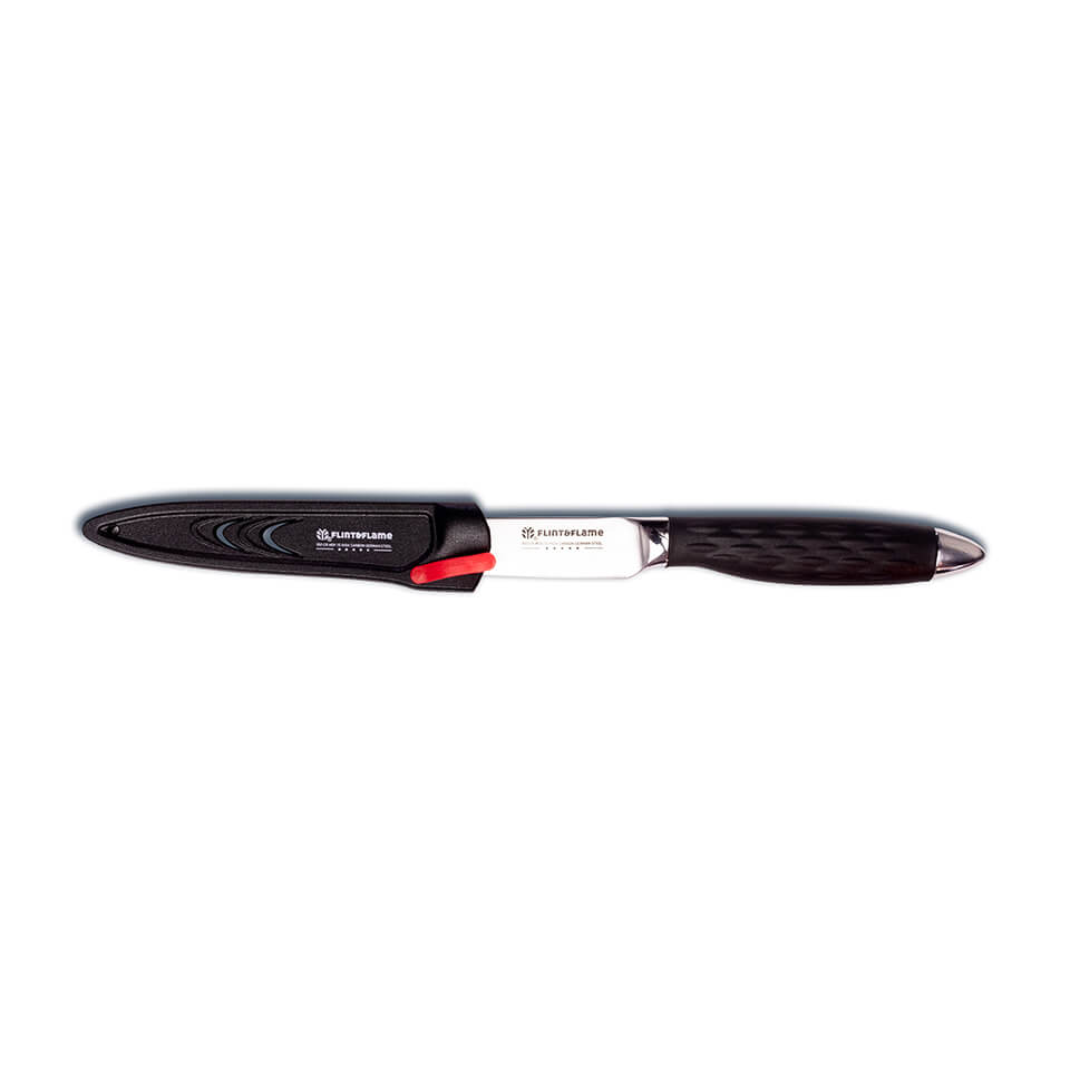 The Pro Series 5” Utility knife features our distinctive high impact silicone handle for extra grip with a modern appearance. The Utility knife is as the name suggests: it’s perfect for all types of kitchen work. Similar to a paring knife, it’s ideal for small intricate cuts and work in the kitchen particularly vegatables and fruit. This Flint & Flame knife arrives in our lockable blade cover.
