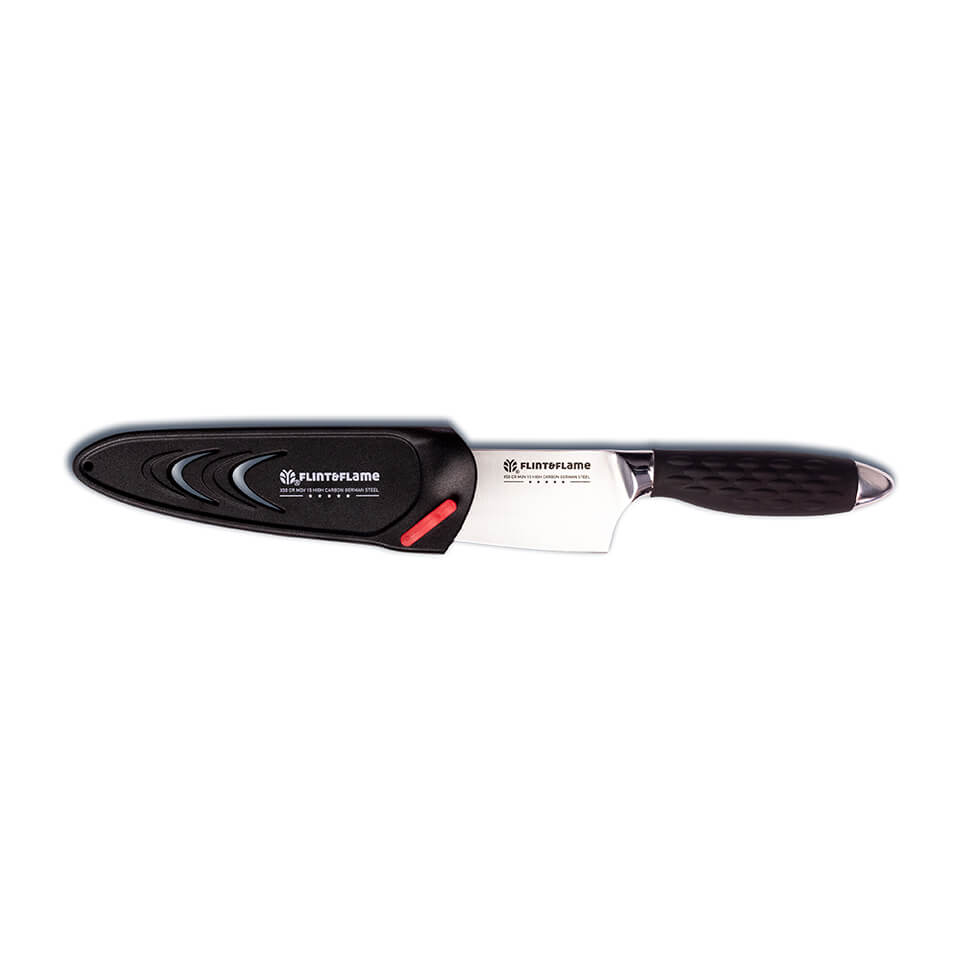The perfect size kitchen knife! It’s shorter blade allows for greater control and nimbleness, especially with chopping, slicing, dicing and mincing smaller vegetables, fruits and cuts of meat. This Flint & Flame knife arrives in our lockable blade cover.