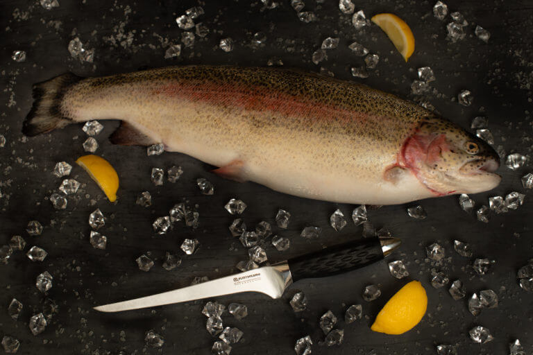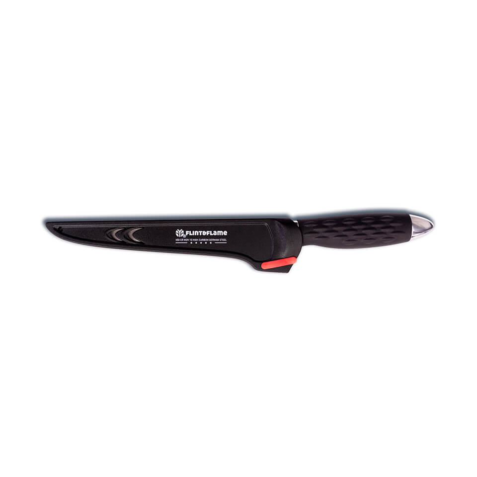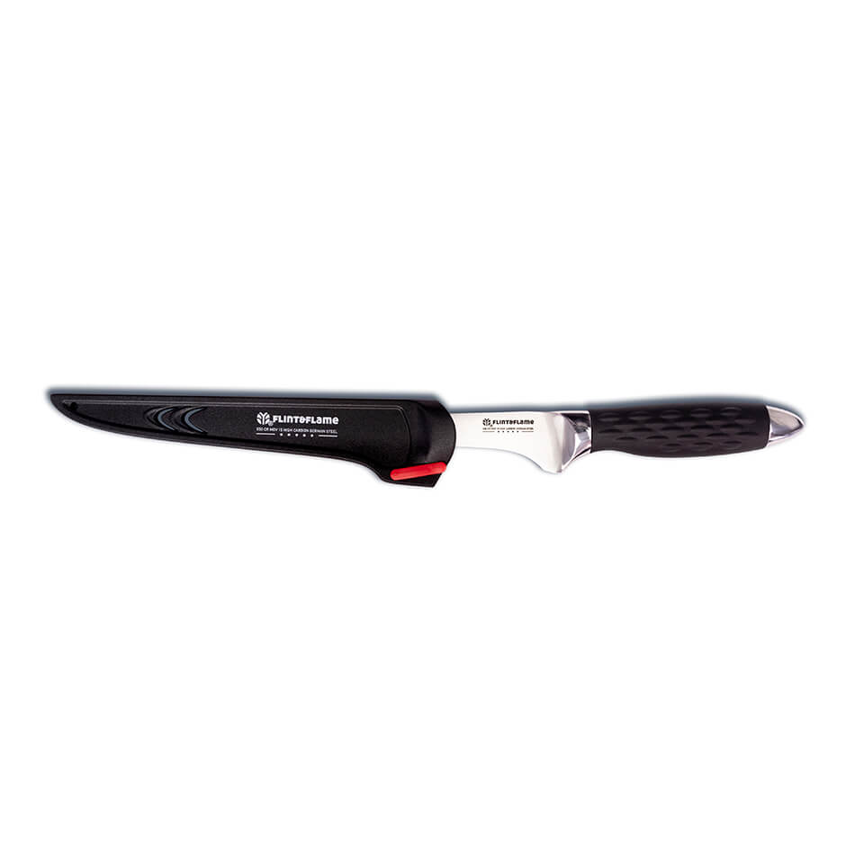 The Pro Series 7” Fillet knife features our dinstinctive high impact silicone handle for extra grip with a modern appearance. The perfect size for not only skinning fish or trimming fish meat, but for other work in the kitchen that needs fine, delicate filet cuts. Its flexible blade is exceptional. This Flint & Flame knife arrives in our lockable blade cover.