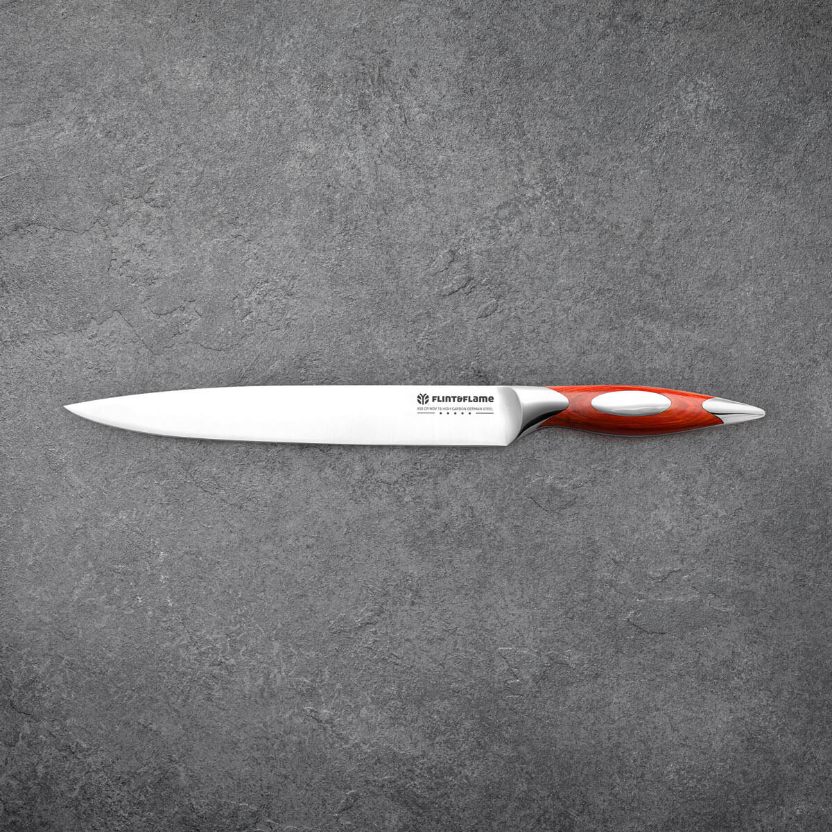 The 9″ Carving knife for Thanksgiving turkey or Sunday family roast presented in our velvet lined black card box. Slightly longer than most carving blades, the 9” Carving Knife will ensure easy and thin slices. Its razor-sharp point makes it ideal for both boned and boneless joints. And the thinner blade allows for precision and maneuverability to achieve that perfect cut as you plate dinner.