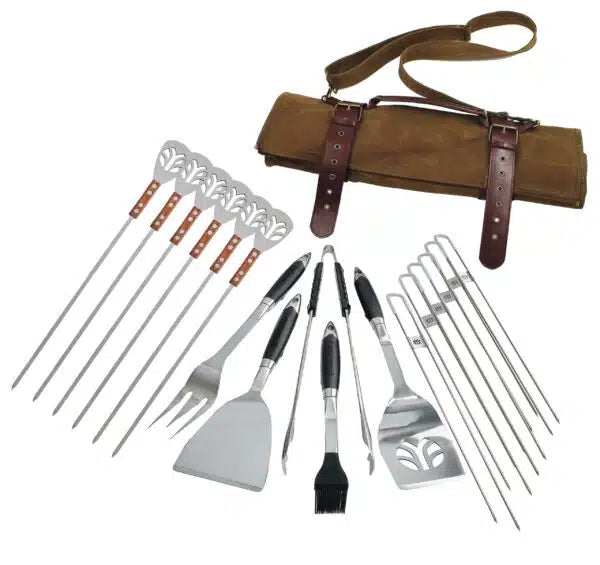 - This 19-Piece Set Includes: Spatula, Fork, Tongs, Scraper, Silicone Brush (with Replacement Head), 6x Dual Prong Skewers, and 6x Kebab Skewers in a Canvas Leather Wrap
