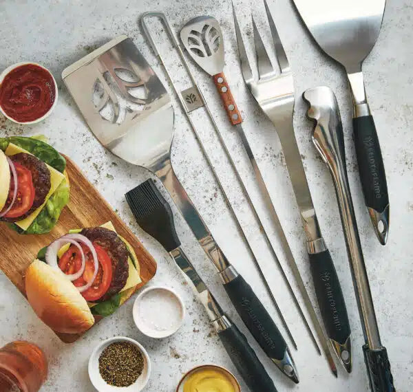 - Spatula, Fork, Tongs, Dual Prong Skewers, Kebab Skewers are all 45cm in length