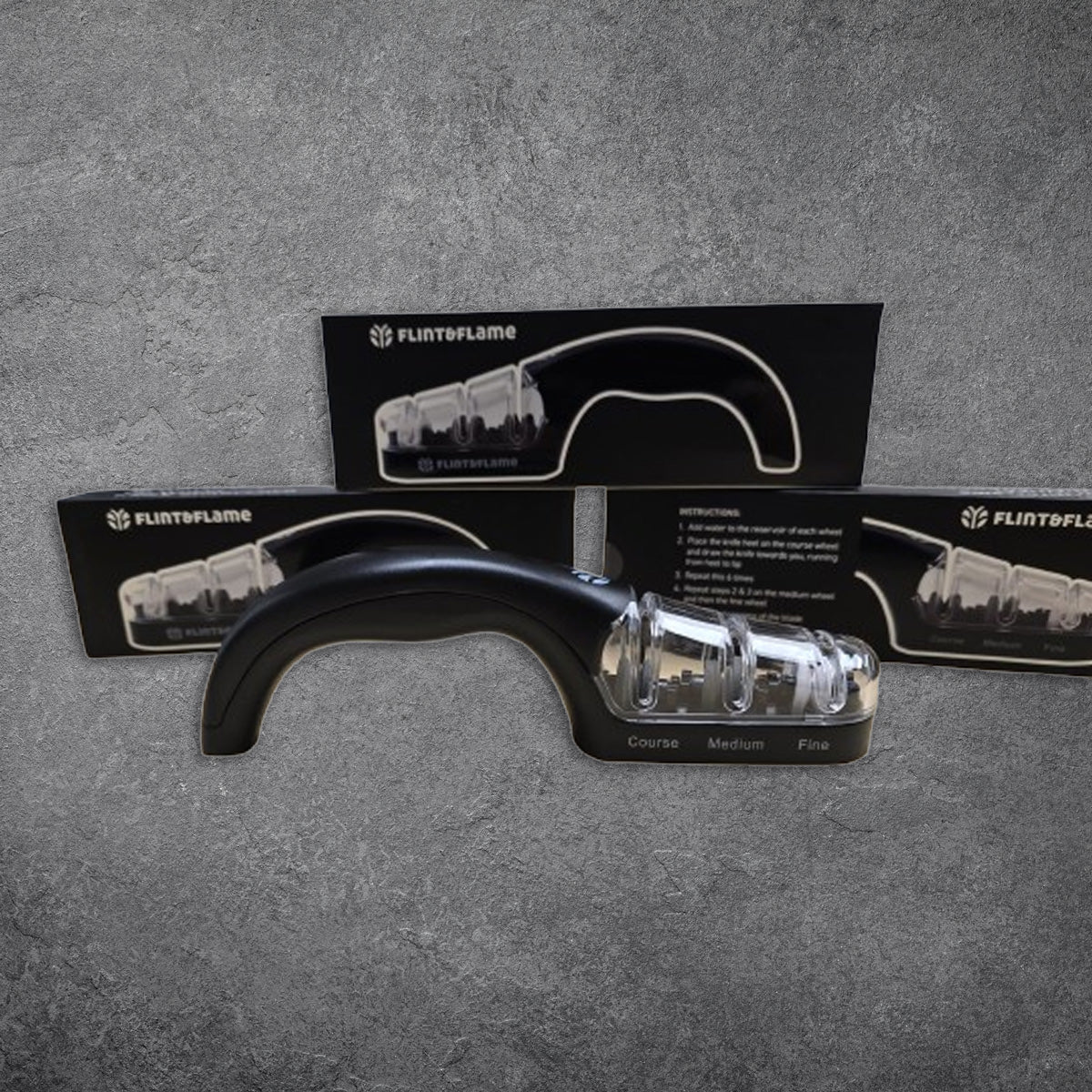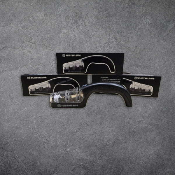 The wheels are angled to 15 degrees to match the cutting angle on our Flint & Flame knives.